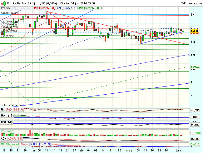 En el medio plazo, Bankia, se impulsa desde el soporte de los 0,67 euros, acelera tendencia, y supera el 100% de recuperación de todo el impulso bajista previo, anulando la formación de doble techo, hasta encontrar obstáculos en los 1,63 euros que fuerzan una consolidacion.