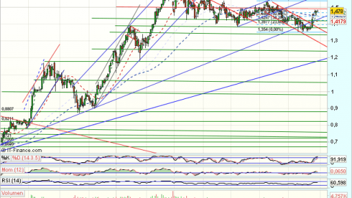 En el medio plazo, Bankia, se impulsa desde el soporte de los 0,67 euros, acelera tendencia, y supera el 100% de recuperación de todo el impulso bajista previo, anulando la formación de doble techo, hasta encontrar obstáculos en los 1,63 euros que fuerzan una consolidacion.