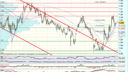En el medio plazo, Bankia, se impulsa desde el soporte de los 1,068 euros en un pullback a resistencias en 1,35 euros que fuerzan un doble techo, seguido de una consolidación a soportes en 1,00 euros.