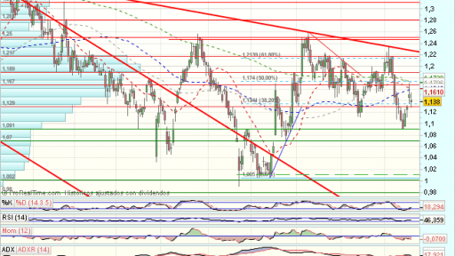 En el medio plazo, Bankia, se impulsa desde el soporte de los 1,068 euros en un pullback a resistencias en 1,35 euros que fuerzan un doble techo, seguido de una consolidación a soportes en 1,00 euros.