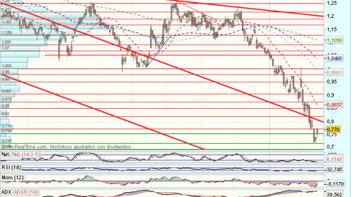 En el medio plazo, Bankia, se impulsa desde el soporte de los 1,068 euros en un pullback a resistencias en 1,35 euros que fuerzan un doble techo, seguido de una consolidación a soportes en 1,00 euros.