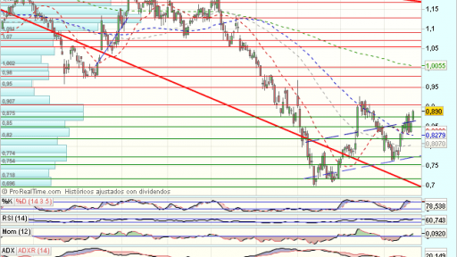 En el medio plazo, Bankia, se impulsa desde el soporte de los 1,068 euros en un pullback a resistencias en 1,35 euros que fuerzan un doble techo, seguido de una consolidación a soportes.