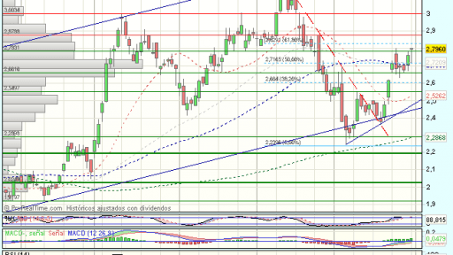 Bankinter, vuelve a encontrarse bajo presión compradora en la sesión de hoy, y cotiza con beneficios del 1,79% hasta los 2.85 euros, confirmando la superación de los máximos previos y el 61,8% de recuperación de toda la caída previa desde los 3,2 euros.