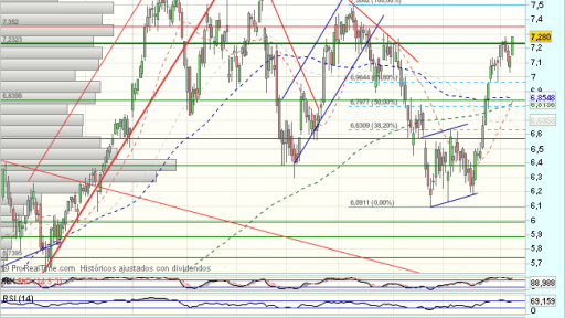 El BBVA, se encuentra bajo ligera presión compradora en la sesión de hoy, tras las alzas de ayer y cotiza con beneficios del 0,40%, en los 7,3090 euros, dando continuidad al impulso alcista iniciado en los 6,1 euros.
