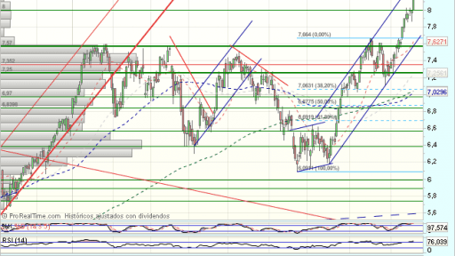 El BBVA, desde los 4,2 euros, mantenía una clara tendencia alcista que se vio acelerada, tras realizar un doble suelo en el nivel de los 5,7 euros, hasta encontrar obstáculos en forma de triple techo en los 7,6 euros, que fuerzan un impulso correctivo.