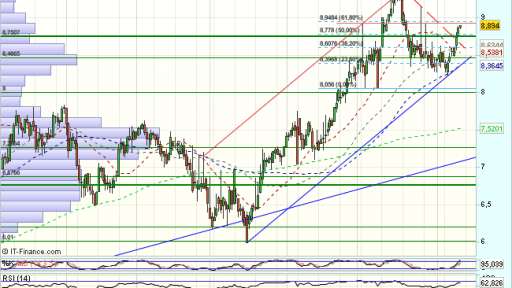 En el corto plazo, tras escapar del canal alcista, encuentra obstáculos ante la resistencia relevante de los 9.5 euros, que fuerza una consolidación, hasta los 8,23 euros, donde encuentra apoyos para un nuevo impulso alcista, con primeros objetivos en los ……….Sigue https://www.mercadosencontinuo.es/bbva-analisis-tecnico-45.html