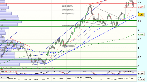 En el medio plazo, tras escapar del canal alcista, encuentra obstáculos ante la resistencia relevante de los 9,5 euros, que fuerza una consolidación, hasta los 8,17 euros, donde encuentra apoyos en forma de doble suelo, para un nuevo impulso alcista