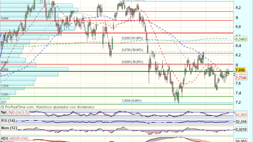 En el medio plazo, encuentra obstaculos en los los 9,35 euros, en forma de doble techo, que fuerzan un trhrowback a soportes.
