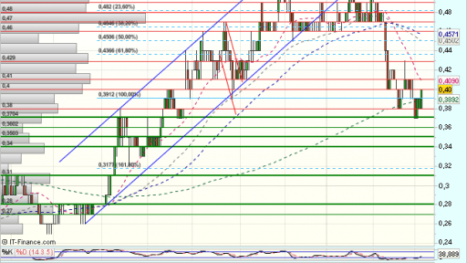 En en el medio plazo, encuentra obstáculos en los 0,51 euros, que fuerzan una consolidación, hasta la base del canal alcista, desde donde inicia un nuevo impulso alcista, que deriva en un rago lateral.