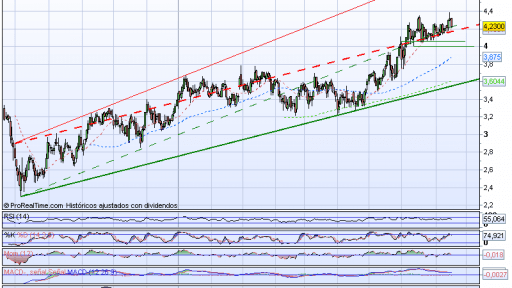 El valor presenta por tanto un tendencia alcista a medio pero a corto plazo se encuentra en proceso de consolidación, escenario que se mantendría mientras el precio respete el soporte de los 4 – 4,06