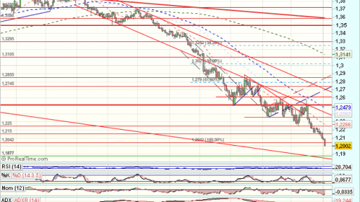 El cruce Euro – dólar, en el largo plazo, tras encontrar techo en los 1,60 dolares, smantiene una tendencia bajista que encuentra apòyos en los 1,20, desde donde rebota.