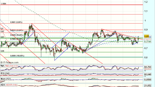 En el medio plazo, encuentra obstáculos en los 1,99 euros, que fuerzan una consolidación, que perfora la media de 200 sesiones. Se apoya en forma de doble suelo en los 0,57, para un nuevo impulso alcista.