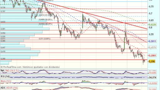 En el medio plazo, encuentra obstáculos en los 1,99 euros, que fuerzan una consolidación, que perfora la media de 200 sesiones. Se apoya en forma de doble suelo en los 0,57, para un nuevo impulso alcista, hasta los 0,91, que fuerzan una consolidacion.