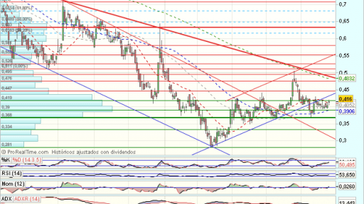 En el medio plazo, encuentra obstáculos en los 1,99 euros, que fuerzan una consolidación, que perfora la media de 200 sesiones. Se apoya en forma de doble suelo en los 0,57, para un nuevo impulso alcista, hasta los 0,91, que fuerzan una consolidacion.