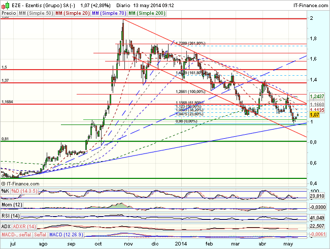 La tendencia de Ezentis en el largo plazo, sigue siendo muy bajista, aunque en el medio plazo, inicia un fuerte impulso alcista en los 0,45 euros, que supera la media de 200 sesiones y acelera tendencia a su paso por los 0,78 euros.