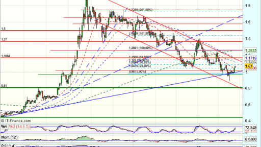 En las últimas sesiones, encuentra apoyos en forma de doble suelo en los 1,06, para un fuerte rebote, hasta el techo del canal bajista, que fuerza un trhrowback a soportes en 0,96 desde donde rebota, con primeros objetivos en los ……….Sigue en https://www.mercadosencontinuo.es/mapa