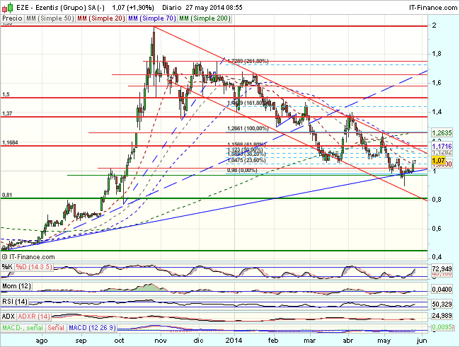 La tendencia de Ezentis en el largo plazo, sigue siendo muy bajista, aunque en el medio plazo, inicia un fuerte impulso alcista en los 0,45 euros, que supera la media de 200 sesiones y acelera tendencia a su paso por los 0,78 euros.