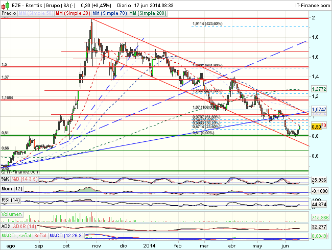 La tendencia de Ezentis en el largo plazo, sigue siendo muy bajista, aunque en el medio plazo, inicia un fuerte impulso alcista en los 0,45 euros, que supera la media de 200 sesiones y acelera tendencia a su paso por los 0,78 euros.