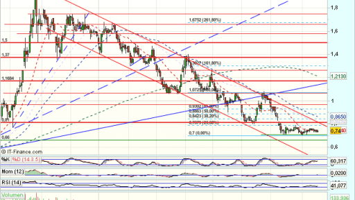 En el corto plazo, encuentra obstáculos en los 1,99 euros, que fuerzan una consolidación, que perfora la media de 200 sesiones. Se apoya en forma de doble suelo en los 0,81, para un nuevo impulso alcista, hasta la resistencia y techo del canal.