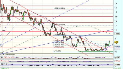 En el corto plazo, encuentra obstáculos en los 1,99 euros, que fuerzan una consolidación, que perfora la media de 200 sesiones. Se apoya en forma de doble suelo en los 0,81, para un nuevo impulso alcista, hasta la resistencia y techo del canal.