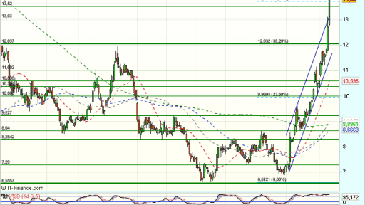 FCC, sigue siendo hoy el campeón indiscutible del Ibex 35, y anda disparada, con alzas del 7,87%, hasta los 13,84 euros, confirmando la superación de la resistencia y doble techo de los 12 euros y el 50% de recuperación de todo el impulso bajista previo desde los 20,8 euros.