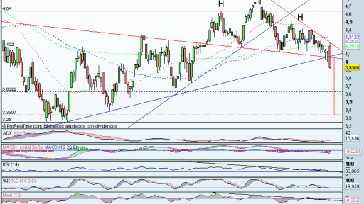 En la sesión de ayer la cotización de Fiat ha confirmado con mucha fuerza la ruptura de la línea de tendencia alcista que sostenía las cotizaciones desde el mes de mayo y, al mismo tiempo, ha completado la figura de hombro-cabeza-hombro que se venía formando desde el mes de agosto, al romper con fortísimo volumen la neckline que une los mínimos de dicha figura chartista.