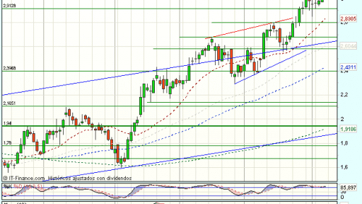 Gamesa se encuentra bajo presión compradora en la sesión de hoy, dando continuidad al impulso iniciado en el soporte de los 2,85 y cotiza con beneficios del 0,83%, hasta los 3,025 euros, acercándose a la resistencia y máximos previos en los 3,08 euros.