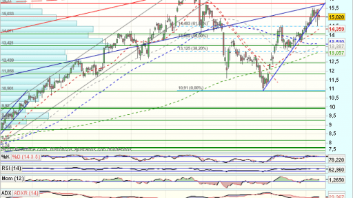 En el medio plazo, Gamesa supera el 100% de recuperación de toda la caída previa desde 2011, hasta resistencias en 16,5, que fuerzan una consolidación.