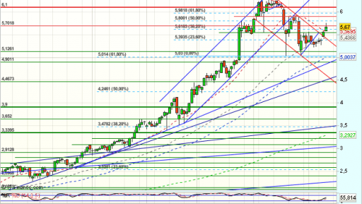 Gamesa se encuentra bajo fuerte presión compradora en la sesión de hoy, superando el 38,2% de recuperación del impulso bajista previo desde los 6,55 euros, y cotiza con beneficios del 3,16%, hasta los 5,7210 euros.