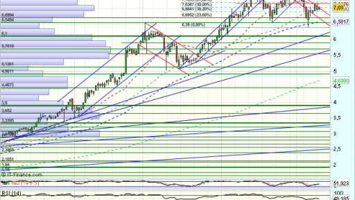 En el medio plazo, tras consolidar ante los 6,55 euros, hasta los 5 euros, vuelve a impulsarse fuertemente al alza. Supera el 100% del impulso bajista previo y los máximos previos, hasta los 7,5 euros que frenan las alzas, dando lugar a una formacion de doble techo de largo plazo, que de no ser anulado tendria un significado fuertemente bajista y que fuerzan una consolidacion.