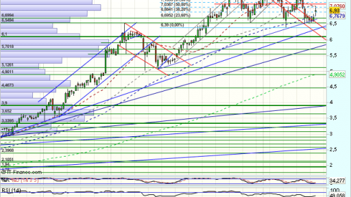 En el medio plazo, supera el 100% del impulso bajista previo y los máximos previos, hasta los 7,5 euros que frenan las alzas, dando lugar a una formacion de doble techo de largo plazo, que de no ser anulado tendria un significado fuertemente bajista y que fuerzan una consolidacion.