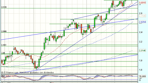 La tendencia de largo plazo de Gamesa sigue siendo muy bajista, aunque en el corto – medio plazo, define una clara tendencia alcista canalizada, que tras encontrar apoyos en los 1,6 euros, base del canal y media de 200 sesiones, acelera tendencia superando el techo del canal.