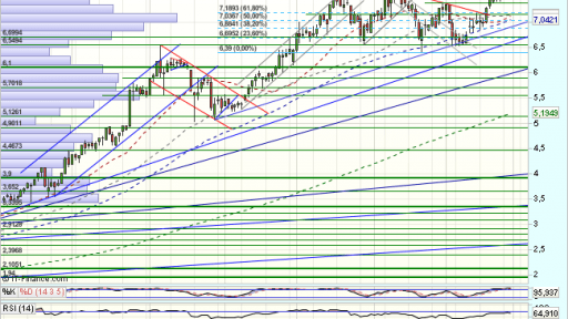 En el medio plazo, supera el 100% del impulso bajista previo y los máximos previos, hasta los 7,5 euros que frenan las alzas, dando lugar a una formacion de doble techo de largo plazo, que de no ser anulado tendria un significado fuertemente bajista y que fuerzan una consolidacion.