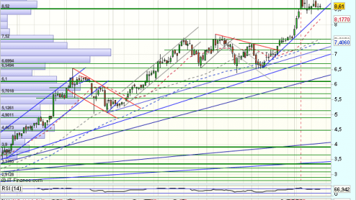 En el medio plazo, supera el 100% de recuperación de toda la caída previa desde 2011, en los 7,5 euros que frenan las alzas, dando lugar a una formación de doble techo tanto en el largo, como en el corto plazo, que fuerza una consolidación hasta los 6,52 euros.