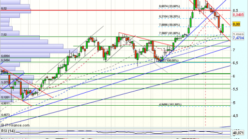 En el medio plazo, supera el 100% de recuperación de toda la caída previa desde 2011, en los 7,5 euros que frenan las alzas, dando lugar a una formación de doble techo tanto en el largo, como en el corto plazo, que fuerza una consolidación hasta los 6,52 euros en forma de triple techo con connotaciones alcistas.