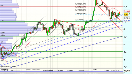 En el medio plazo, supera el 100% de recuperación de toda la caída previa desde 2011, en los 7,5 euros que frenan las alzas, dando lugar a una formación de doble techo tanto en el largo, como en el corto plazo, que fuerza una consolidación hasta los 6,52 euros en forma de triple techo con connotaciones alcistas.