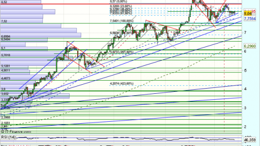 En el medio plazo, supera el 100% de recuperación de toda la caída previa desde 2011, en los 7,5 euros que frenan las alzas, dando lugar a una formación de doble techo tanto en el largo, como en el corto plazo, que fuerza una consolidación hasta los 6,52 euros en forma de triple suelo, impulsando al alza hasta los 9,25 euros, que fuerzan una consolidación.