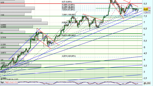 En el medio plazo, supera el 100% de recuperación de toda la caída previa desde 2011, en los 7,5 euros que frenan las alzas, dando lugar a una formación de doble techo tanto en el largo, como en el corto plazo, que fuerza una consolidación hasta los 6,52 euros en forma de triple suelo, impulsando al alza hasta los 9,25 euros, que fuerzan una consolidación.