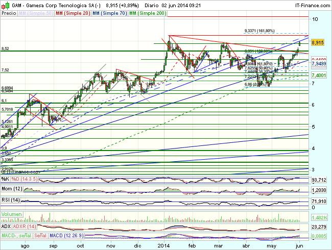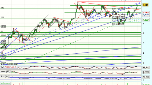 En el medio plazo, supera el 100% de recuperación de toda la caída previa desde 2011, en los 7,5 euros que frenan las alzas, dando lugar a una consolidación lateral con techo en los 8,4 euros.