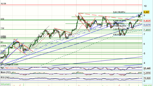 En el medio plazo, supera el 100% de recuperación de toda la caída previa desde 2011, en los 7,5 euros que frenan las alzas, dando lugar a una consolidación lateral con techo en los 8,4 euros.