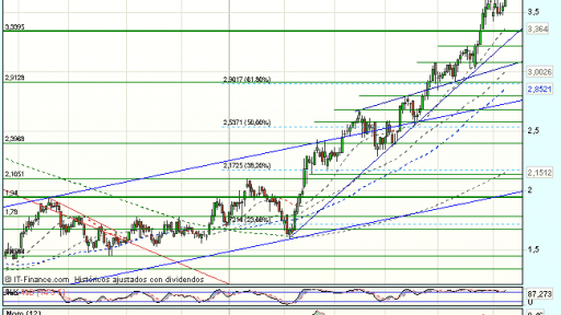 Gamesa se encuentra bajo fuerte presión compradora en la sesión de hoy, continuando el impulso alcista del viernes y cotiza con beneficios del 3,93%, hasta los 3,679 euros, superando la resistencia en los 3,65 euros.