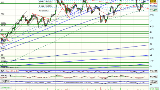 En el medio plazo, supera el 100% de recuperación de toda la caída previa desde 2011, en los 7,5 euros que frenan las alzas, dando lugar a una consolidación lateral con techo en los 8,4 euros, que rompe al alza.