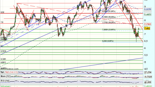 En el medio plazo, supera el 100% de recuperación de toda la caída previa desde 2011, en los 7,5 euros que frenan las alzas, dando lugar a una consolidación lateral con techo en los 8,4 euros, que rompe al alza.