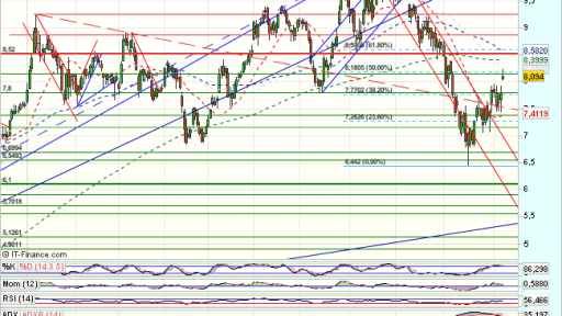 En el medio plazo, supera el 100% de recuperación de toda la caída previa desde 2011, en los 7,5 euros que frenan las alzas, dando lugar a una consolidación lateral con techo en los 8,4 euros, que rompe al alza.