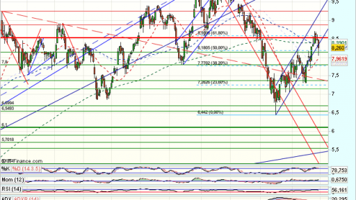 En el medio plazo, supera el 100% de recuperación de toda la caída previa desde 2011, en los 7,5 euros que frenan las alzas, dando lugar a una consolidación lateral con techo en los 8,4 euros, que rompe al alza.
