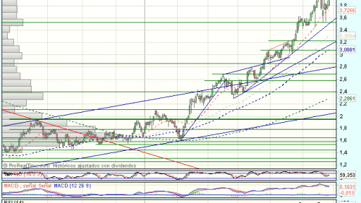 La tendencia de largo plazo de Gamesa sigue siendo muy bajista, aunque en el corto – medio plazo, define una fuerte tendencia alcista canalizada, que tras encontrar apoyos en los 1,6 euros, base del canal y media de 200 sesiones, acelera tendencia superando el techo del canal.