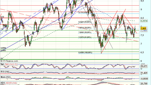 En el medio plazo, Gamesa supera el 100% de recuperación de toda la caída previa desde 2011, en los 7,5 euros que frenan las alzas, dando lugar a una consolidación lateral con techo en los 8,4 euros, que rompe al alza, hasta los 9,9 euros, que fuerzan una consolidación.