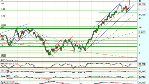 En el medio plazo, Gamesa supera el 100% de recuperación de toda la caída previa desde 2011, en los 7,5 euros que frenan las alzas, dando lugar a una consolidación lateral con techo en los 8,4 euros, que rompe al alza, hasta los 9,9 euros, que fuerzan una consolidación.