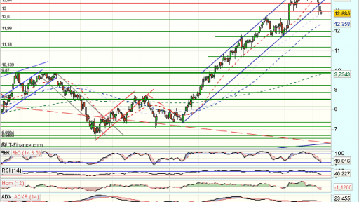 En el medio plazo, Gamesa supera el 100% de recuperación de toda la caída previa desde 2011, en los 7,5 euros que frenan las alzas, dando lugar a una consolidación lateral con techo en los 8,4 euros, que rompe al alza, hasta los 9,9 euros, que fuerzan una consolidación.