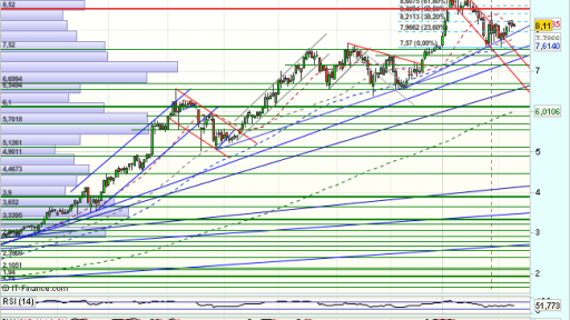 En el medio plazo, supera el 100% de recuperación de toda la caída previa desde 2011, en los 7,5 euros que frenan las alzas, dando lugar a una formación de doble techo tanto en el largo, como en el corto plazo, que fuerza una consolidación hasta los 6,52 euros en forma de triple suelo, impulsando al alza hasta los 9,25 euros, que fuerzan una consolidación.